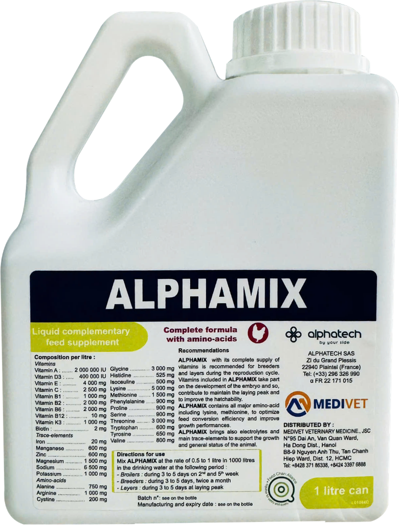- ALPHAMIX với việc cung cấp đầy đủ Vitamin, sản phẩm được khuyến nghị sử dụng cho gà giống và gà đẻ trong chu kỳ sinh sản. ALPHAMIX ngăn chặn sự thiếu hụt các nhóm Vitamin B, kích thích sự tăng trưởng và sinh sản nói chung của gia cầm. Các Vitamin có trong - ALPHAMIX tham gia vào sự phát triển của phôi, vì vậy ALPHAMIX duy trì năng suất thời gian đẻ ở tỷ lệ cao và cải thiện khả năng nở.