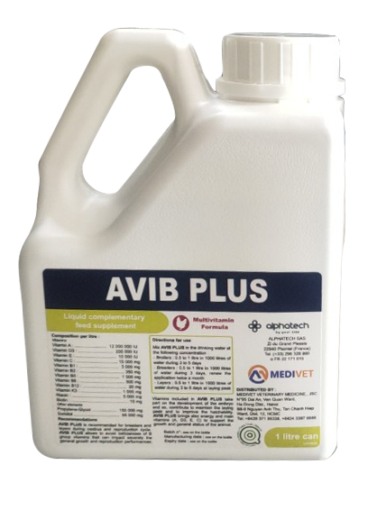 AVIB PLUS - dung dịch bổ sung cho gia cầm. AVIB PLUS là một chất bổ sung Vitamin tổng hợp, khuyến cáo dùng cho gà giống và gà đẻ trong chu kỳ động dục và sinh sản. AVIB PLUS ngăn chặn sự thiếu hụt vitamin nhóm B. Tăng hiệu suất sinh trưởng và sinh sản chung của gia cầm.