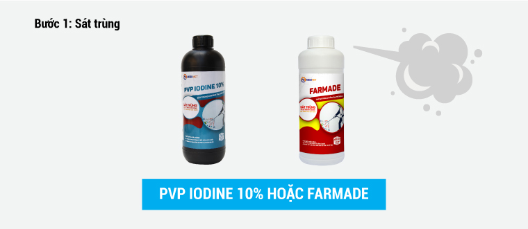 - Dùng PVP IODINE 10% hoặc FARMADE liều 3ml/1lít nước, phun 4 lít đã pha/100 m2, phun vào không khí trong và ngoài chuồng nuôi 1 lần/ngày.