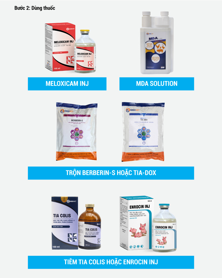 - Hạ sốt bằng MELOXICAM INJ tiêm với liều 1ml/12-13kg/ngày. Bơm MDA SOLUTION với liều 5ml/5-10ml nước/heo.