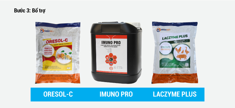- Pha ORESOL-C 1g/1lít nước cho heo uống toàn đàn. Con nào nặng, nên truyền Gluco vào xoang phúc mạc (heo con 10-15 ml/ngày, heo nái, hậu bị và heo đực 1-2 lít/ngày)