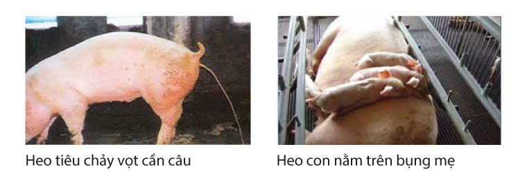 - Tiêu chảy phân nước đầu tiên phân vàng lỏng sau đó chuyển sang màu màu tro xám, sền sệt như bùn đất, mùi hôi rất khó chịu, nôn ói trên heo ở mọi lứa tuổi.