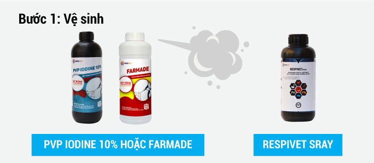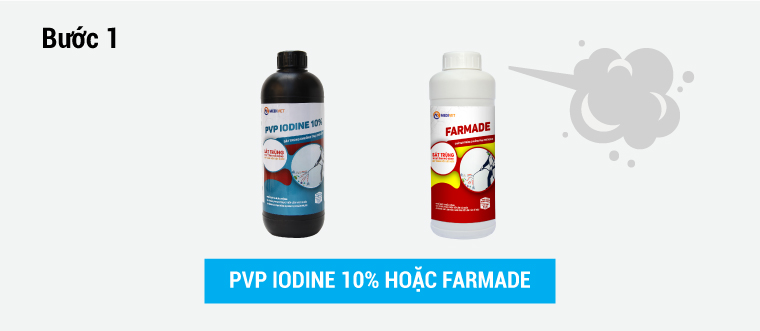 FARMADE với liều 2 ml/1 lít nước hoặc PVP IODINE 10% với liều 3 ml/1 lít nước phun 5 - 7 ngày liên tục.